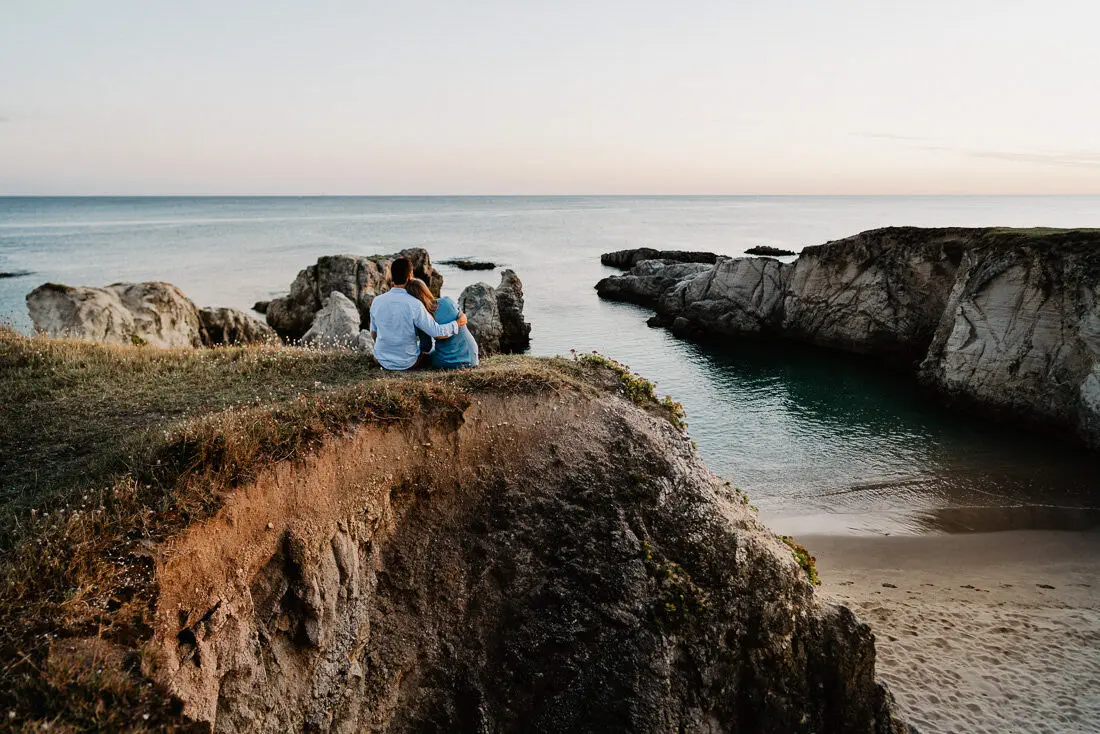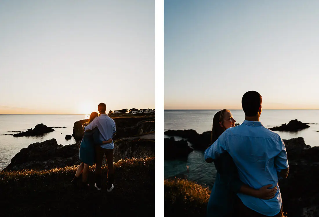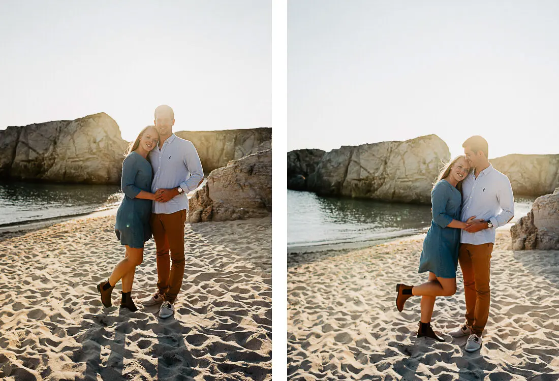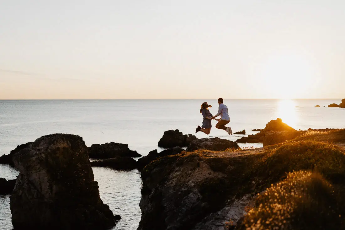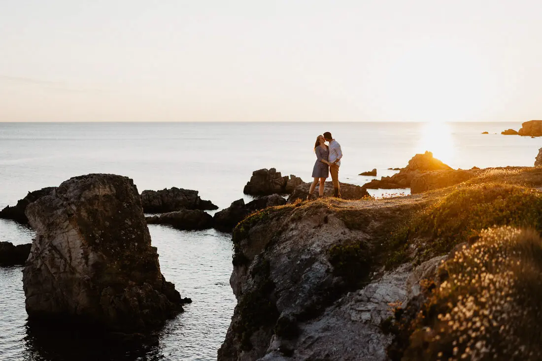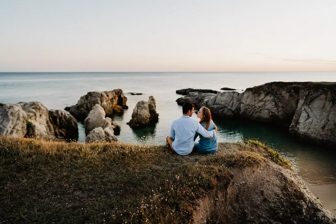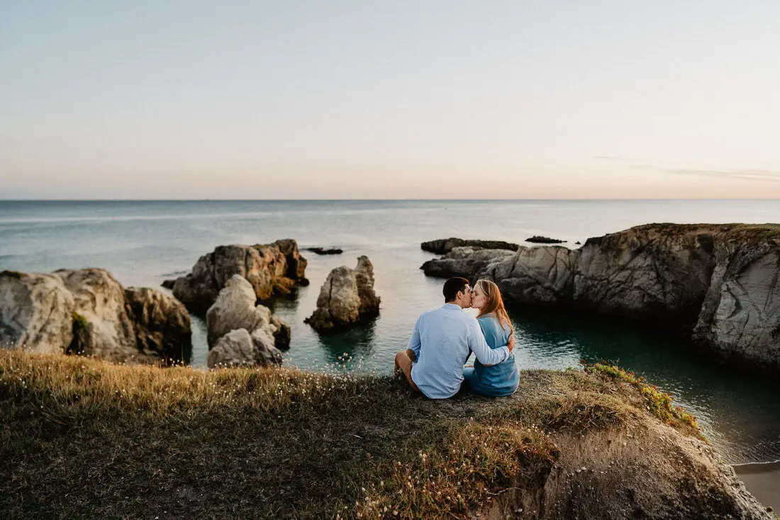 Séance photo couple entre La Baule et Le Pouliguen, au coucher du soleil, pour des images naturelles, lumineuses et pleines de complicité en bord de mer. Ce jeune couple de Nantes a été photographié dans un cadre idyllique entre plage, rochers et lumière dorée, idéal pour une séance photo couple romantique sur la côte atlantique.
