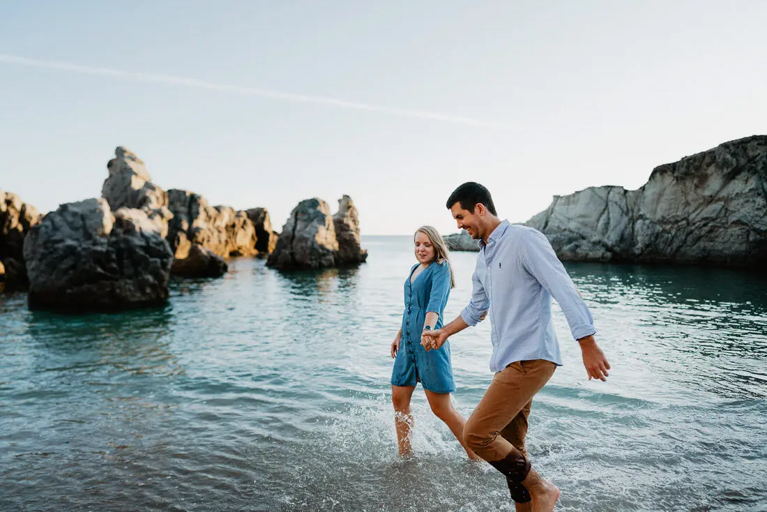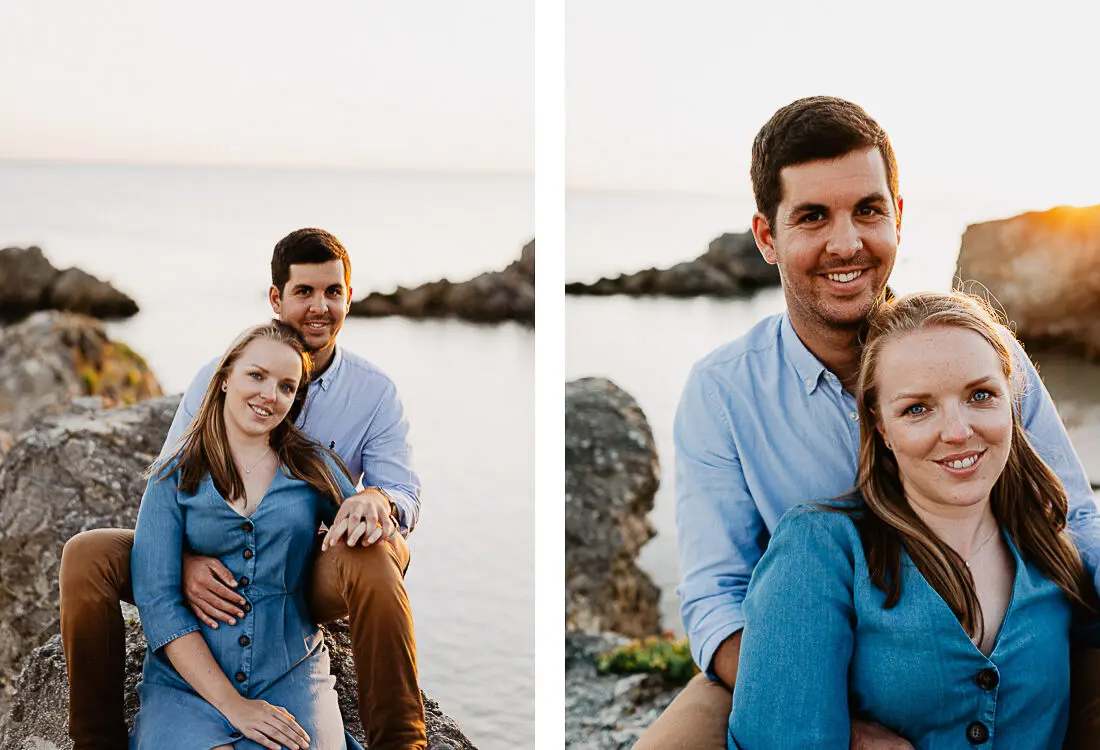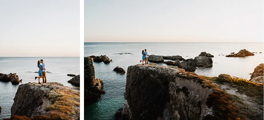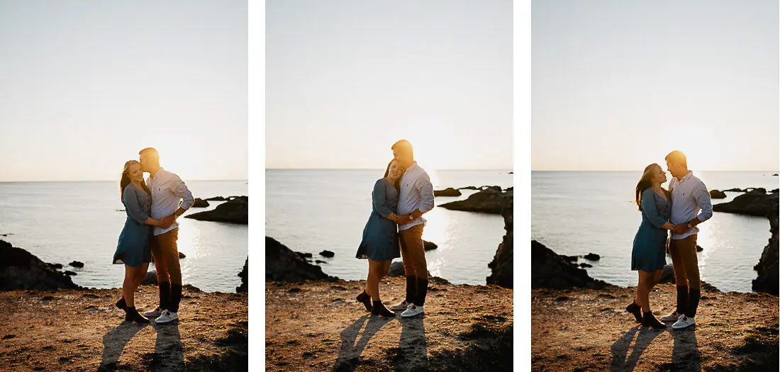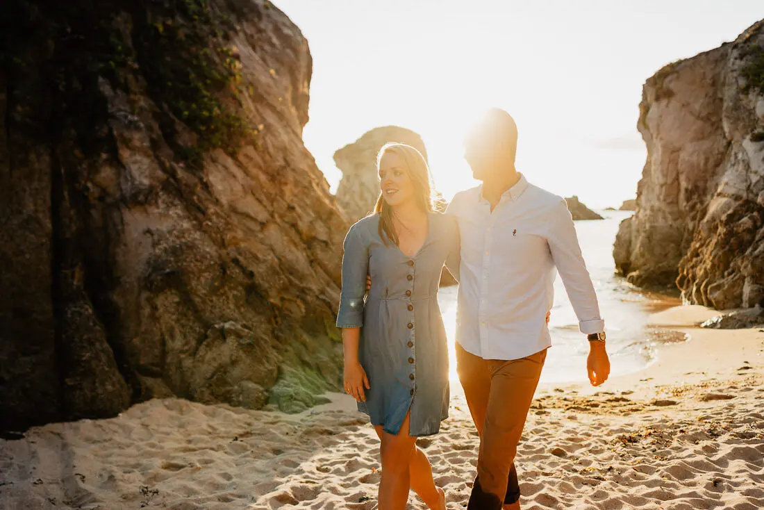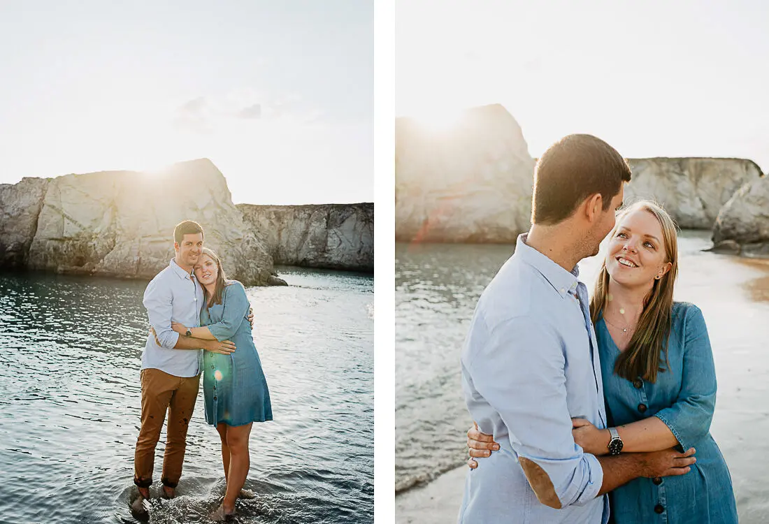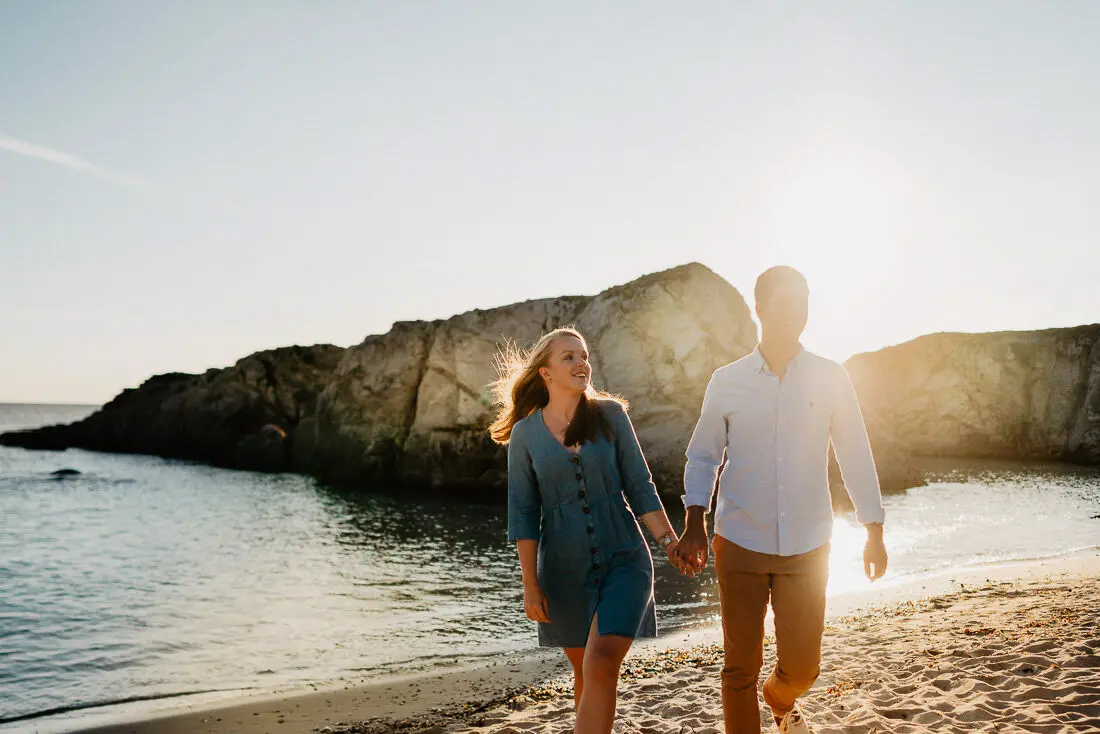Séance photo couple entre La Baule et Le Pouliguen, au coucher du soleil, pour des images naturelles, lumineuses et pleines de complicité en bord de mer. Ce jeune couple de Nantes a été photographié dans un cadre idyllique entre plage, rochers et lumière dorée, idéal pour une séance photo couple romantique sur la côte atlantique.