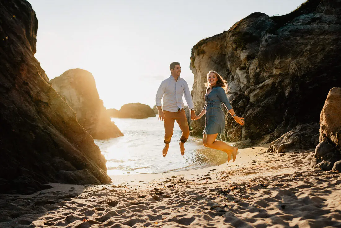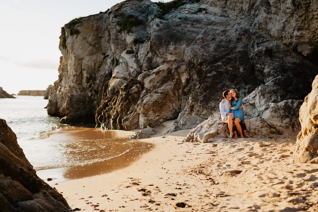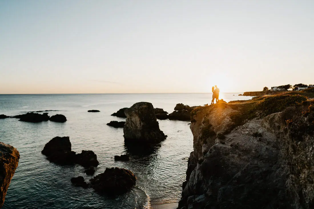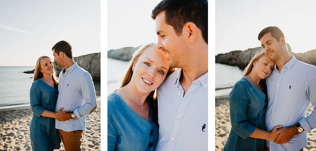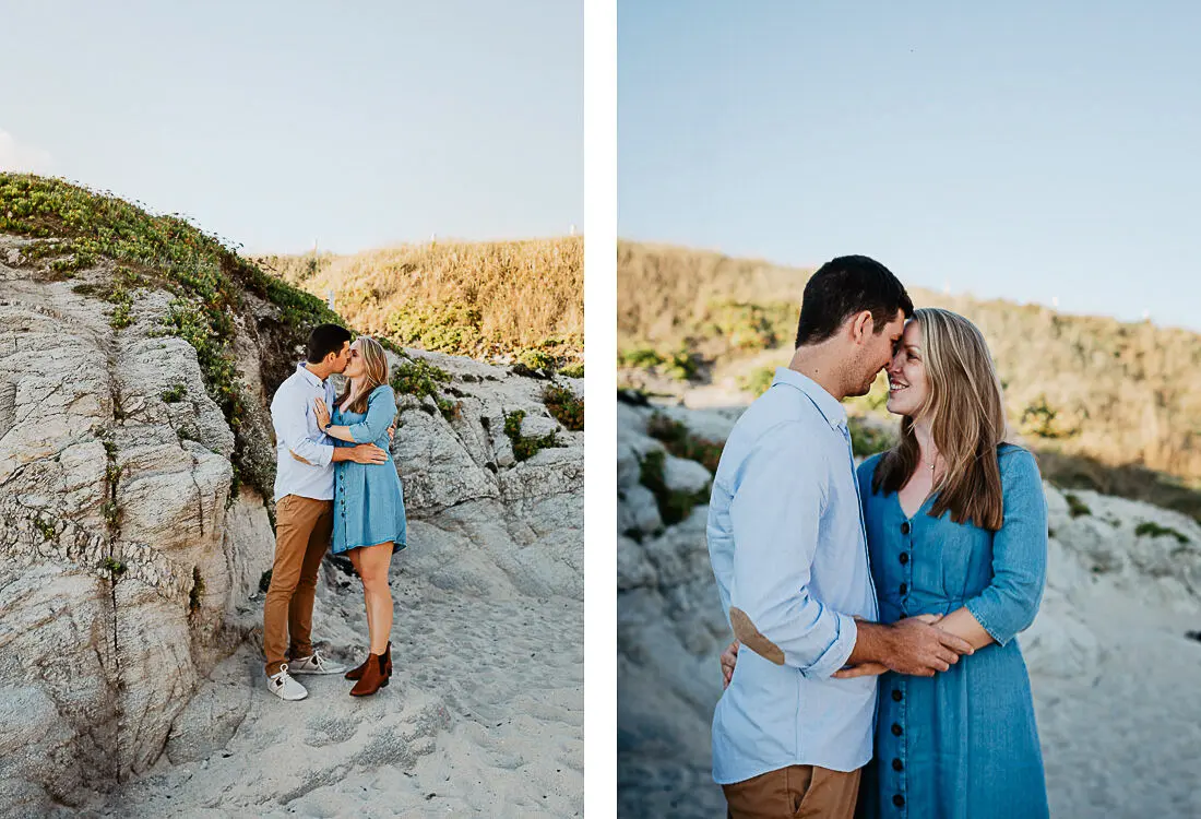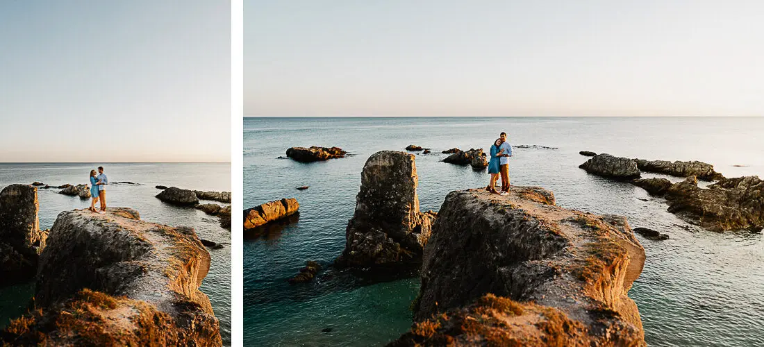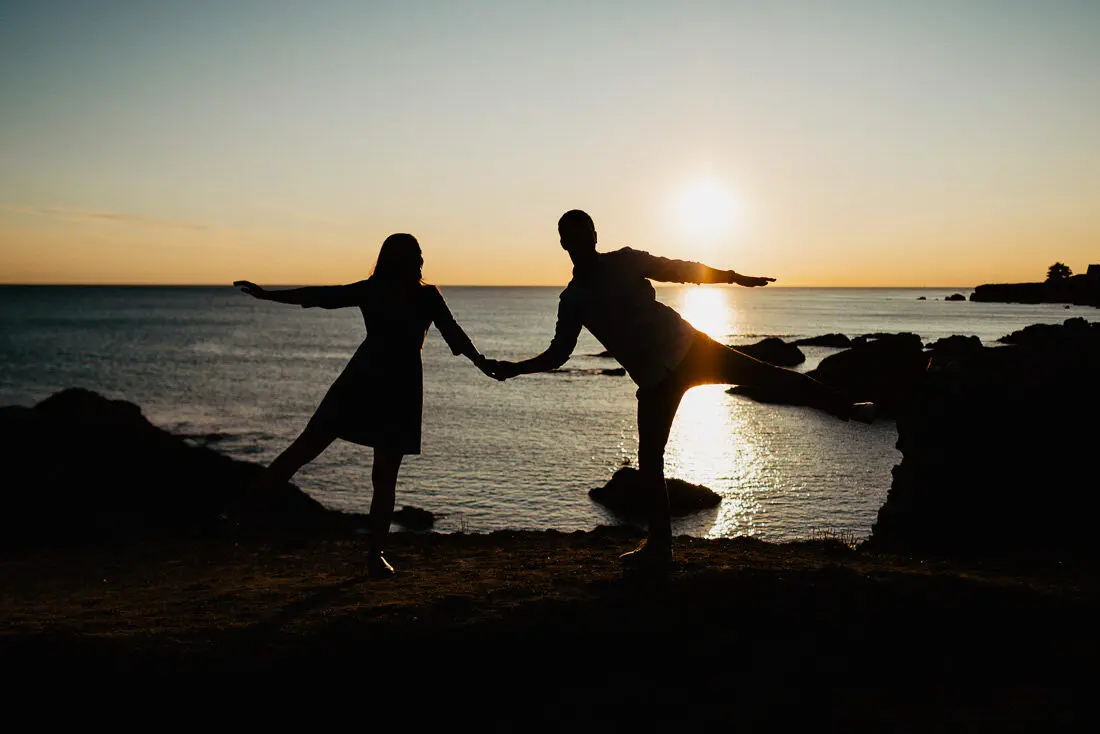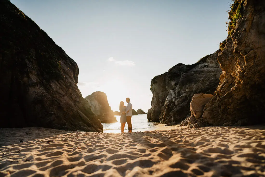Séance photo couple entre La Baule et Le Pouliguen, au coucher du soleil, pour des images naturelles, lumineuses et pleines de complicité en bord de mer. Ce jeune couple de Nantes a été photographié dans un cadre idyllique entre plage, rochers et lumière dorée, idéal pour une séance photo couple romantique sur la côte atlantique.