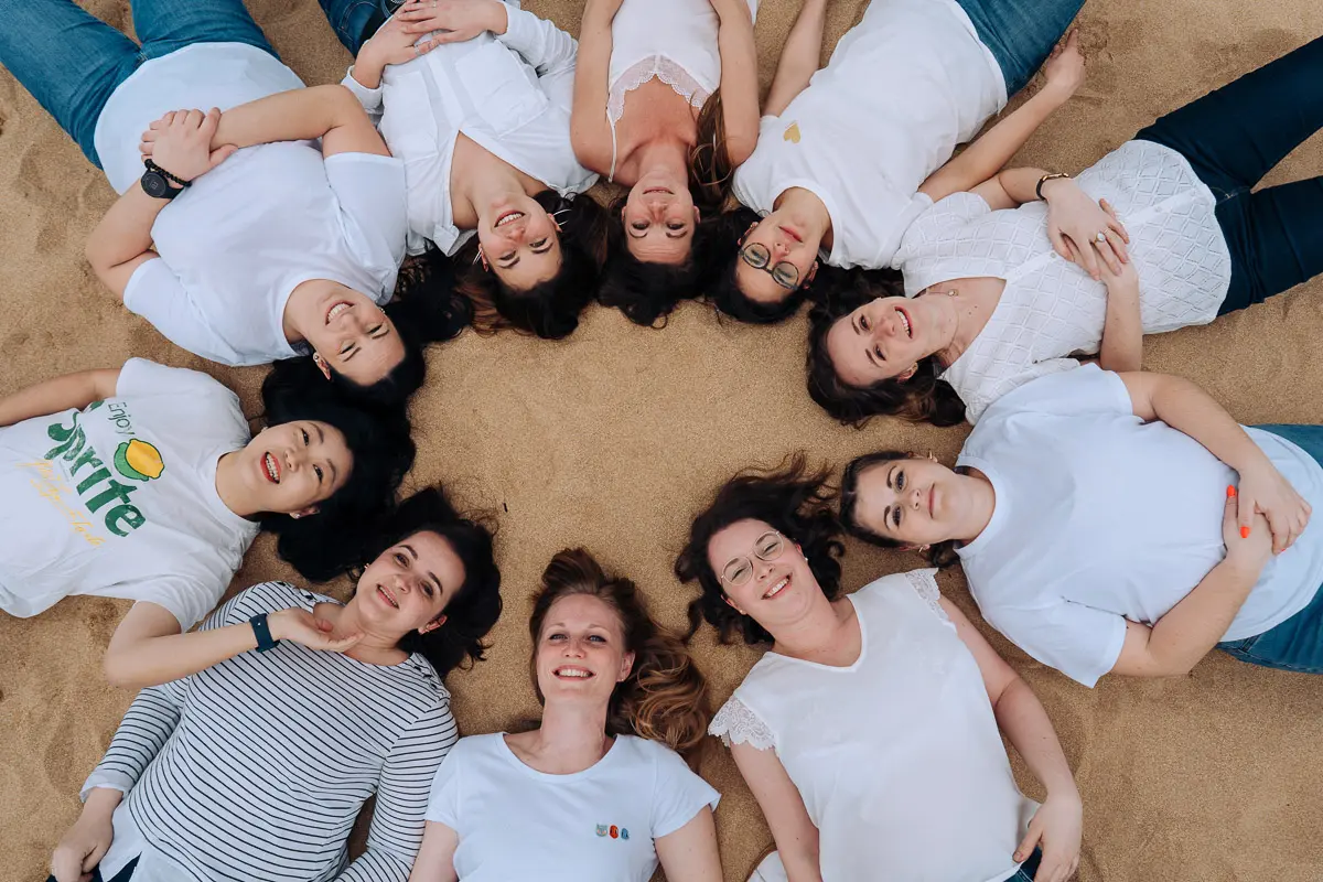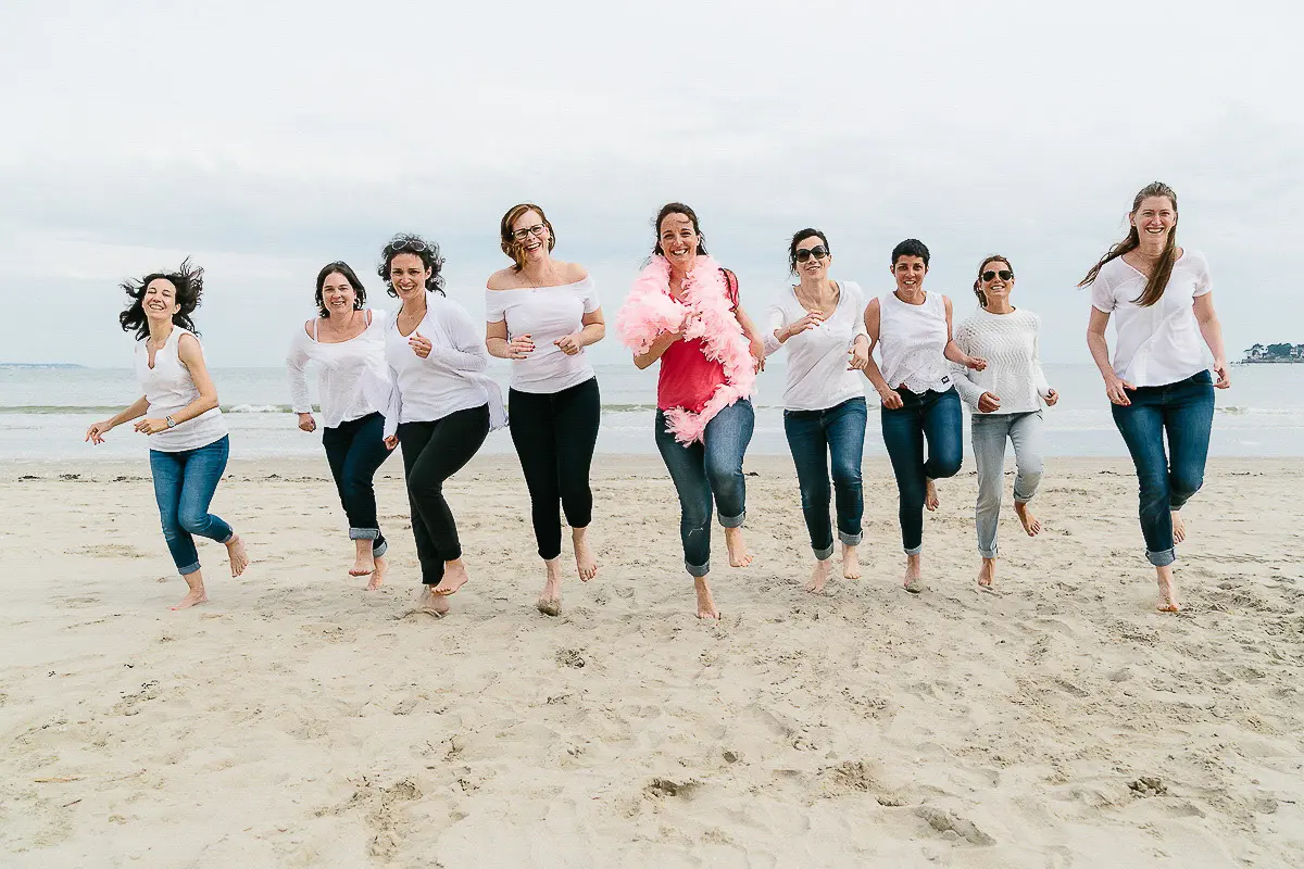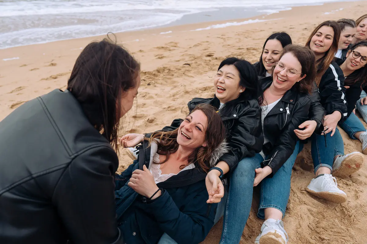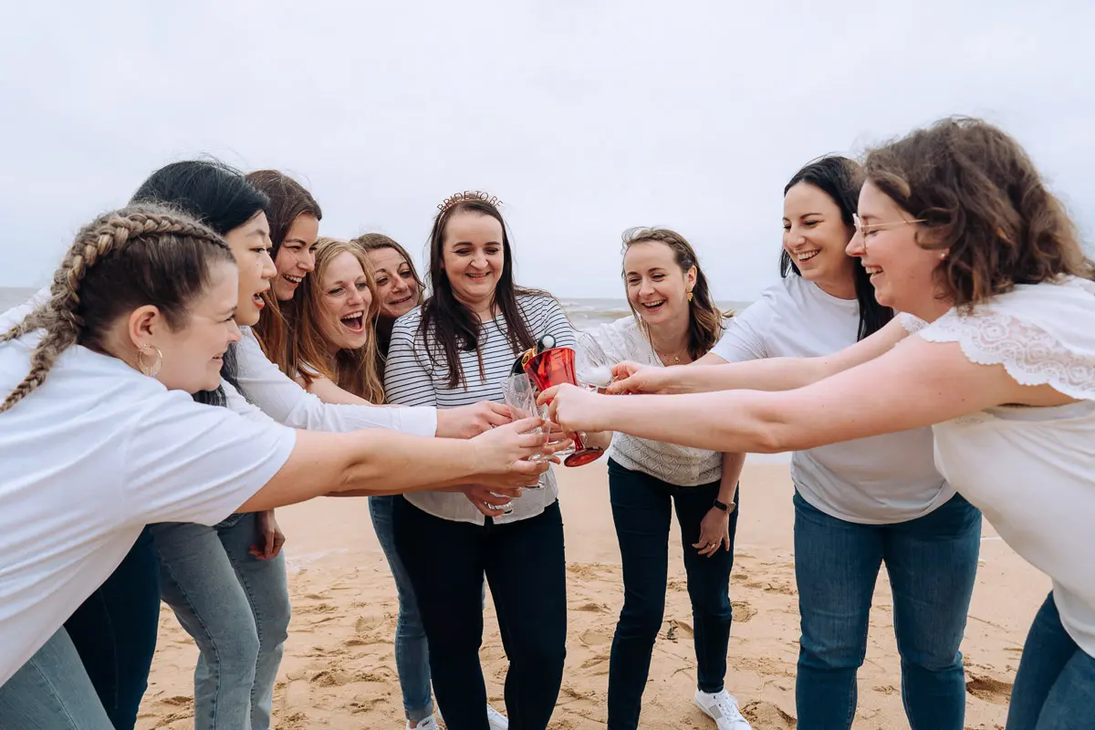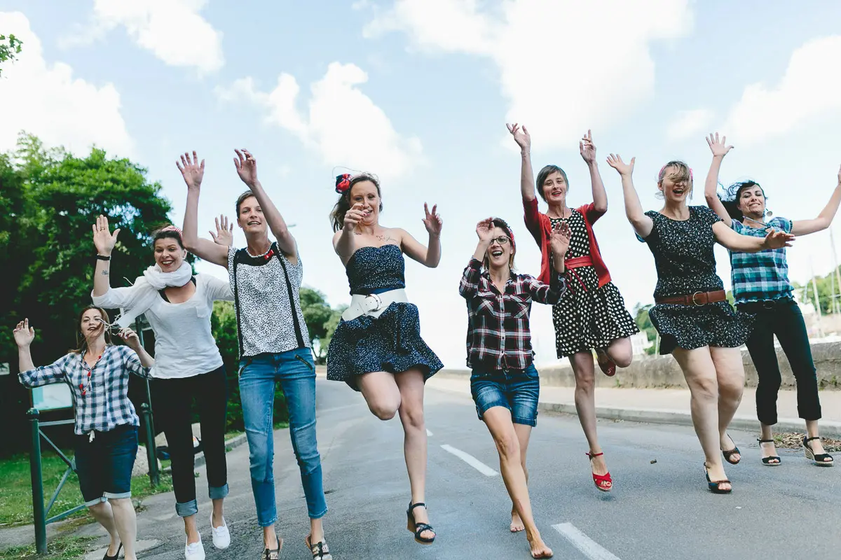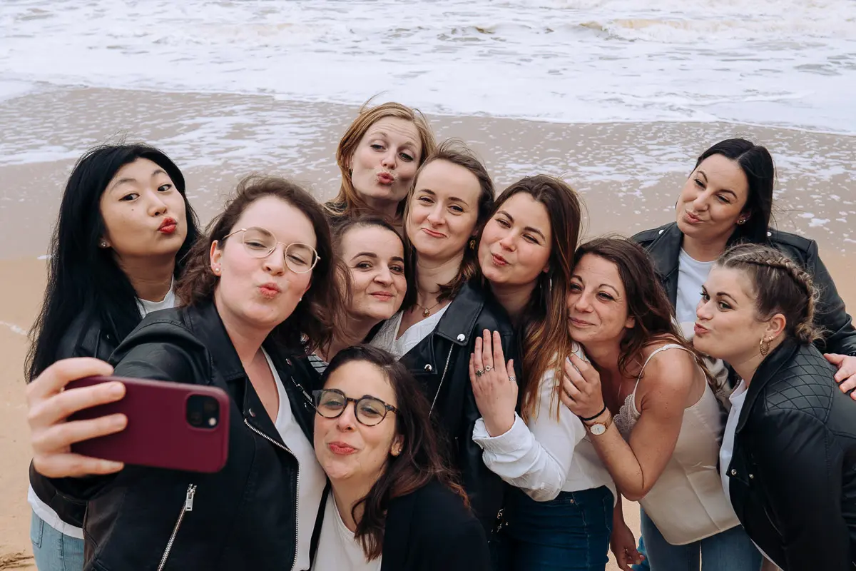 Aucun souci ! Même si vous vous pensez "pas photogéniques", un photographe EVJF professionnel sait vous guider, vous mettre à l'aise et proposer des poses simples et naturelles qui vous mettent en valeur. L'ambiance de groupe, les rires entre copines et le mouvement aident naturellement à oublier l'appareil photo pour obtenir des images spontanées et authentiques. Je vous donne des petites instructions tout au long de la séance (où vous mettre, comment bouger, quoi faire avec vos mains...) pour que tout se passe en douceur. Le résultat : des photos naturelles où vous êtes radieuses !